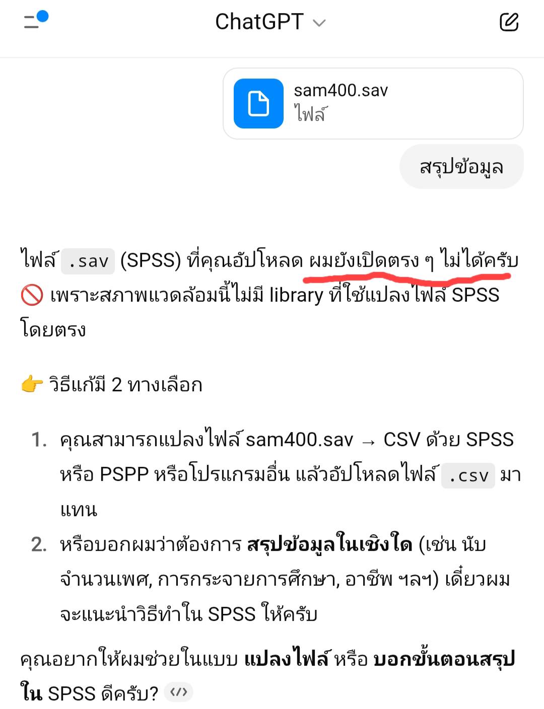 แฟ้ม .sav หรืออื่น ๆ ที่ เอไอ ยังไม่รองรับ อไอ มีความสามารถในการ generate ข้อมูลมาให้เราอย่างเหลือล้น แล้วพบว่า เราสามารถอัพโหลดข้อมูล เพื่อประกอบการประมวลผลไปร้วมกับ prompt ในหลายรูปแบบ แต่บางรูปแบบ เช่น .sav ซึ่งมีลักษณะเฉพาะที่ไม่มี library ของบริษัทผู้พัฒนา ((spss)) สนับสนุนในเอไอ ส่วนรูปแบบ .csv นั้น เอไอสามารถเข้าใจได้ ทั้งแบบแนบต่อท้ายโพสต์ไปกับเนื้อหาใน prompt หรือ upload file แต่มีข้อจำกัดเรื่องจำนวนรายการ เช่น 400 รายการ (taro yamane) พบว่า เอไอที่ได้ทดสอบ 5 ตัว ไม่มีตัวใด สามารถประมวลผลได้อย่างมีประสิทธิผล